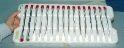The bridgewire is usually made of gold, but platinum or gold/platinum alloys can also be used. The most common commercial wire size is 0.038 mm (1.5 mils) in diameter and 1 mm (40 mils) in length, but lengths ranging from 0.25 mm to 2.5 mm (10 mils to 100 mils) can be encountered. From the available explosives, only PETN at low densities can be initiated by sufficiently low shock to make its use practical in commercial systems as a part of the EBW initiator. It can be chained with another explosive booster, often a pellet of tetryl, RDX or some PBX (e.g., PBX 9407). Detonators without such booster are called initial pressing detonators (IP detonators).