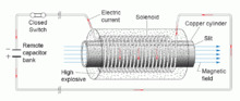 - A longitudinal magnetic field is produced inside a hollow metallic conductor, by discharging a bank of capacitors into the solenoid that surrounds the cylinder. To ensure a rapid penetration of the field in the cylinder, there is a slit in the cylinder, which closes rapidly as the cylinder deforms;