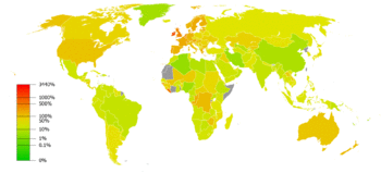 The World Bank and IMF hold that "a country can be said to achieve external debt sustainability if it can meet its current and future external debt service obligations in full, without recourse to debt rescheduling or the accumulation of arrears and without compromising growth". According to these two institutions, "bringing the net present value (NPV) of external public debt down to about 150 percent of a country's exports or 250 percent of a country's revenues" would help eliminating this "critical barrier to longer-term debt sustainability".[7] High external debt is believed to be harmful for the economy.[8]