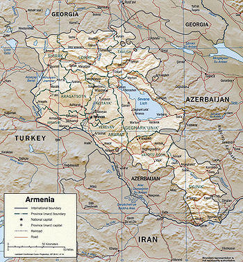 Twenty-five million years ago, a geological upheaval pushed up the Earth's crust to form the Armenian Plateau, creating the complex topography of modern Armenia.[1] The Lesser Caucasus range extends through northern Armenia, runs southeast between Lake Sevan and Azerbaijan, then passes roughly along the Armenian-Azerbaijani border to Iran.[1] Thus situated, the mountains make travel from north to south difficult.[1] Geological turmoil continues in the form of devastating earthquakes, which have plagued Armenia.[1] In December 1988, the second largest city in the republic, Leninakan (now Gyumri), was heavily damaged by a massive quake that killed more than 25,000 people.[1]