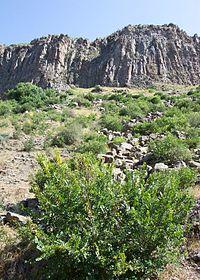 Temperatures in Armenia generally depend upon elevation.[1] Mountain formations block the moderating climatic influences of the Mediterranean Sea and the Black Sea, creating wide seasonal variations with cold snowy winters, and warm to hot summers.[1] On the Armenian Plateau, the mean midwinter temperature is 0 °C (32 °F) to −15 °C (5 °F), and the mean midsummer temperature is 15 °C (59 °F) to 30 °C (86 °F).[1] Average precipitation ranges from 250 millimeters (9.8 in) per year in the lower Araks River valley to 800 millimeters (31.5 in) at the highest altitudes.[1] Despite the harshness of winter in most parts (with frosts reaching −40 °C (−40 °F) and lower in Shirak region), the fertility of the plateau's volcanic soil made Armenia one of the world's earliest sites of agricultural activity.[1]