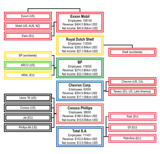ExxonMobil is one of the largest of the world's Big Oil companies.[9] As of 2007, it had daily production of 3.921 million BOE (barrels of oil equivalent); but significantly smaller than a number of national companies. In 2008, this was approximately 3% of world production, which is less than several of the largest state-owned petroleum companies.[10] When ranked by oil and gas reserves, it is 14th in the world—with less than 1% of the total.[11][12] ExxonMobil's reserves were 20 billion BOE at the end of 2016 and the 2007 rates of production were expected to last more than 14 years.[13] With 37 oil refineries in 21 countries constituting a combined daily refining capacity of 6.3 million barrels (1,000,000 m3), ExxonMobil is the seventh largest refiner in the world,[14][15][16] a title that was also associated with Standard Oil since its incorporation in 1870.[2]