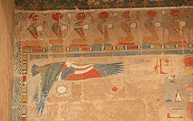 The violent form of the Eye was also invoked in religious ritual and symbolism as an agent of protection. The uraeus on royal and divine headdresses alludes to the role of the Eye goddesses as protectors of gods and kings.[66] For similar reasons, uraei appear in rows atop shrines and other structures, surrounding and symbolically guarding them against hostile powers. Many temple rituals called upon Eye goddesses to defend the temple precinct or the resident deity. Often, the texts of such rituals specifically mention a set of four defensive uraei. These uraei are sometimes identified with various combinations of goddesses associated with the Eye, but they can also be seen as manifestations of "Hathor of the Four Faces", whose protection of the solar barque is extended in these rituals to specific places on earth.[67]