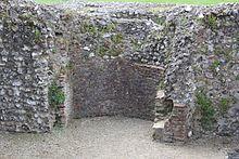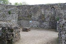 In the north-west corner of the bailey are the foundations of the great kitchen.[35] The north-east corner is occupied by the remains of the 12th-century hall complex, built from flint stone, with green sandstone dressings and Roman tiles, and comprising a solar, a hall and forebuildings, of which only the foundations now survive.[38] The solar itself was located on the first floor of the building, with its undercroft forming a separate apartment, probably for the use of the castle bailiff.[35] The first floor of the hall would have been used for public business and living space, and the undercroft used for storage or living space.[39] The forebuilding was 8.5 by 18.3 metres (28 by 60 ft) internally, linked to the hall by a passageway, and provided additional space, and a kitchen was located at the rear of the hall.[40]