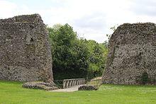 The inner bailey is reached using a bridge over the moat. The original castle bridge was constructed from wood but this was rebuilt with stone facades and piers in the late medieval period, and then subsequently replaced with an earth bank, further improved in the early 19th century; the current timber bridge dates from the 1960s.[36] A gate house originally protected the entrance, with an arched passageway made from Roman brick, flanked by guardrooms; only the foundations now survive.[37]