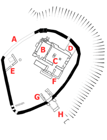 In the early 11th century, a stone building was then built in the manor on top of an artificial terrace, and it is possible that there may have been earlier stone buildings constructed on the same site.[3] The building was surrounded by a ditch and possibly a rampart, each approximately 5 metres (16 ft) wide and up to 3 metres (9.8 ft) deep and high respectively.[4] It is uncertain how far the outer defences reached; they may have traced the shape of the later castle, including a late-Anglo-Saxon cemetery located to the south-east.[4] The complex formed a secure aristocratic residence called a burh and the use of stone, rather than timber, in a secular building such as this was very unusual for the period.[5] Like some other burhs, it may have had an entrance tower called a burh-geat, symbolising the status of the owner.[6]