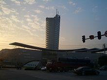 The Ezhou station, 30°21′48″N 114°51′38″E / 30.363343°N 114.860499°E), located southwest of downtown, has an interesting layout, somewhat similar to that of the Secaucus Junction in New Jersey. Until 2014, there was just one rail line there: the north–south Wuhan–Jiujiang Railway, which is served by a large number of trains traveling from Wuhan to Nanchang and points further east and south (Fujian, Zhejiang, etc.). Until 2013, there were no commuter trains in per se in Hubei, but it took only about one hour (usually, with a stop at Huarong) to reach one of Wuhan's train stations (such as Wuchang Railway Station) train station from Ezhou using any of those trains. The distance from the Ezhou station to Wuchang by rail is 82 kilometers (51 mi).[9] In 2014, the Wuhan-Huangshi Line of the Wuhan Metropolitan Area Intercity Railway, the region's new commuter line system, was opened. This line, which runs east–west in the area, has crossed the Wuhan–Jiujiang Railway tracks at the right angle just south of the previously existing Ezhou station. To accommodate the new line, the Ezhou Station was expanded in 2013–2014, with platforms constructed on the new commuter line, providing a possibility for an easy transfer between the two lines. This is said to be the first station in China with this layout.[10]
