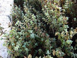 In the Bible, ezov is described as a small plant found on or near walls,[2] with an aromatic odour.[3][4] Maimonides, Saadia Gaon and earlier Jewish commentators identified ezov with za'atar,[5] which may refer to various local herbs, including marjoram, oregano and thyme, which have aromatic and cleansing properties, grow wild in Israel, and can easily be bunched together to be used for sprinkling.[4]