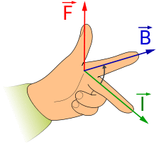 The left hand is held with the thumb, first finger and second finger mutually at right angles.