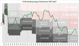 In the late 1970s the team advanced to the quarter finals of the DFB-Pokal on two occasions, and on into the early 1980s moved frequently between third- and fourth-tier play. Then, in the second half of the decade, they enjoyed their greatest success. They played their way back to the second division and on into the Bundesliga in 1986. Homburg played two seasons there, were relegated, and returned for one final Bundesliga season in 1989–90 before beginning a gradual descent which would lead them to Oberliga Südwest (IV) where they play today.