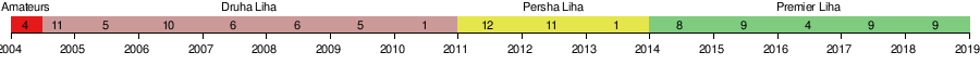 (Druha Liha)11 28 8 3 17 33 54 27 2005–06 5 24 13 2 9 42 28 41 1/32 finals 2006–07 10 28 8 8 12 35 41 32 1/16 finals 2007–08 6 34 19 6 9 66 41 63 1/16 finals 2008–09 6 34 16 9 9 55 32 57 1/32 finals 2009–10 5 26 15 4 7 45 28 49 1/64 finals[9][10] 2010–11 1 22 17 2 3 45 15 53 1/32 finals Promoted 2011–12 2nd