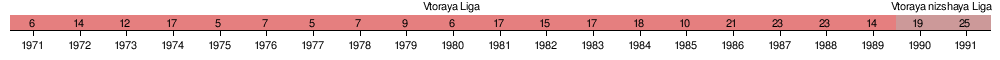 (Vtoraya Liga)17 (26) 50 15 14 21 48 56 44 1984 8 (13) 24 8 7 9 31 29 23 18 (26) 14 5 4 5 23 20 14 1985 2 (14) 26 12 7 7 35 27 31 10 (28) 14 5 1 8 21 33 11 1986 10 (14) 26 9 4 13 28 51 22 21 (28) 14 7 1 6 20 28 15 1987 23 (27) 52 13 13 26 44 77 39 1988 23 (26) 50 13 15 22 39 60 41 1989 14 (27) 52 16 17 19 44 52 49 1990 4th