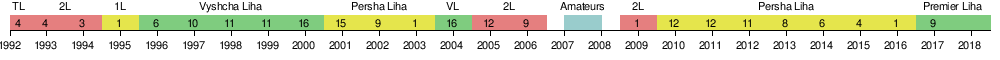 (Persha Liha)12 34 11 13 10 38 40 43 1&fras1;32 finals –3[15] 2010–11 12 34 12 7 15 43 44 43 1&fras1;32 finals 2011–12 11 34 13 5 16 53 49 44 1&fras1;16 finals 2012–13 8 34 14 10 10 46 37 52 1&fras1;32 finals 2013–14 6 30 12 8 10 36 34 44 1&fras1;16 finals 2014–15 4 30 14 7 9 42 27 49 1&fras1;16 finals 2015–16 1 30 20 5 5 49 22 65 1&fras1;8 finals Promoted 2016–17[16] 1st
