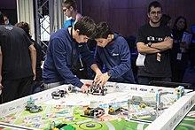 Each year in August,[2] FIRST LEGO League Challenge teams are introduced to a scientific and real-world challenge for teams to focus and research on.[3] The robotics part of the competition involves designing and programming LEGO Mindstorms robots to complete tasks. The students work out a solution to a problem related to the theme (changes every year) and then meet for regional, national and international tournaments to compete, share their knowledge, compare ideas, and display their robots.