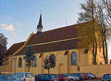 Faaborg Church (Helligåndskirken) is an old monastery church dating from 1477. It formed the south wing of the now demolished Helligåndskloster belonging to the Order of the Holy Ghost from which it gets its name. Its considerable size makes it a local landmark: 46 m (151 ft) long by 19 m (62 ft) wide.[10] The chancel and three-sided east gable were completed in 1490, the nave and southern aisle followed around 1510 and a northern aisle was added shortly thereafter. After its vaulting in 1681, it resembled a basilica. Restoration work was carried out in 1858 and 1902.[11] The church has no tower but the tower of the now demolished Saint Nicholas Church (1450) serves as its belfry.[12]