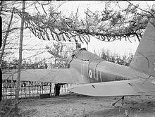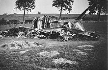 Upon the commencement of the Battle of France in May 1940, Battles were called upon to perform unescorted, low-level tactical attacks against the advancing German army; this use of the type placed the aircraft at risk of attack from Luftwaffe fighters and within easy range of light anti-aircraft guns.[24] In the first of two sorties carried out by Battles on 10 May 1940, three out of eight aircraft were lost, while a further 10 out of 24 were shot down in the second sortie, giving a total of 13 lost in that day's attacks, with the remainder suffering damage. Despite bombing from as low as 250 ft (76 m), their attacks were recorded as having had little impact on the German columns.[26] During the following day, nine Belgian Air Force Battles attacked bridges over the Albert Canal that connects to the Meuse River, losing six aircraft,[9][27] and in another RAF sortie that day against a German column, only one Battle out of eight survived.[28]