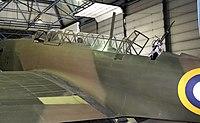 The Battle was furnished with a single cockpit to accommodate a crew of three, these typically being a pilot, observer/navigator and radio operator/air gunner.[13] The pilot and gunner were seated in a tandem arrangement in the cockpit, the pilot in the forward position controlling the fixed .303 Browning machine gun mounted in the starboard wing, while the gunner was in the rear position where he could use the manually-aimed .303 Vickers K machine gun. The observer's position, who served as the bomb aimer, was situated directly beneath the pilot's seat; sighting was performed in the prone position through a sliding panel in the floor of the fuselage using the Mk. VII Course Setting Bomb Sight.[13] Complete with a continuous glazed canopy, the cockpit of the Battle had several similarities to that of a large fighter rather than a bomber.[14]