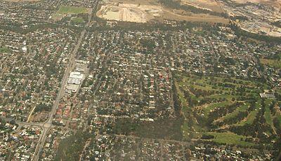Aerial image of Fairview Park, looking north. Hancock Road is the north-south road visible on the left-hand side of the image, and Grenfell Road is the east-west road. They intersect at the roundabout in the bottom-right hand corner. Fairview Park is the area northeast of the roundabout. The northern boundary of the suburb is the quarry at the top of the picture. Tea Tree Gully Golf Course in the green region to the right. The white patch on Hancock Road is a shopping centre.
