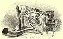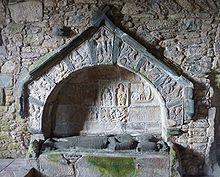 The c. 1800 manuscript stated that both the honour and the very existence of Clan MacLeod was thought to have depended upon the preservation of the Fairy Flag. Only the "highest and purest blood of the race" and the most renowned heroes, were selected to guard the flag when it was displayed. These twelve men, with a sword in hand, would stand just behind the chief who was always put in front. One family produced the hereditary keepers of the flag; and of this family, only the eldest living male could unfurl the flag. This family was called "Clan Tormad Vic Vurichie" ("the children of Tormod, son of Murchadh"), and was descended from Sìol Torcaill.[8] The 20th century Hebridean author Alasdair Alpin MacGregor, when writing of the traditions of the flag, stated that the flag's bearers held lands on Skye near Bracadale for their services to the chiefs of Clan MacLeod.[11] The first of the flag bearers from this family was buried within the same grave as the chief of the clan, on the island of Iona. The second, and last bearer, was buried at St Clements Church, in Rodel, on Harris. This man's remains were covered by a magnificent monument; the stone coffin in which his body was placed, was six feet deep. A movable iron grate rested about two feet from the lid, and the man's body rested upon the grate. The man's male descendants were also deposited within this coffin. This meant that when a newly deceased was placed within, the bones and dust of the previous occupant were sifted through the grate into the coffin below. The writer of the manuscript stated that in the time of his own father, the last male of this family was interred this way. The tomb was then sealed by this man's daughter. The c. 1800 manuscript also noted that this family, prior to its extinction, became miserably poor.[8]
