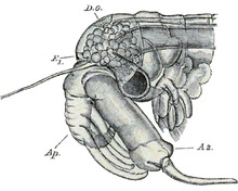 The head contains two digestive glands and the small lobate stomach that they empty into. This is connected to a long intestine, which terminates in a short rectum, with the anus located on the telson.[5] The haemocoel of anostracans is pumped by a long, tubular heart, which runs through most of the animal's length.[5] A series of slits allow haemocoel into the heart, which is then pumped out of the anterior opening by peristalsis.[5] The nervous system consists of two nerve cords which run the length of the body, with two ganglia and two transverse commissures in most of the body segments.[5]