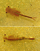Some studies point to fossils resembling fairy shrimp in the Upper Cambrian,[28][29] specifically the oldest known branchiopod fossil, Rebachiella kinnekullensis, from Orsten marine deposits.[30] Despite its seeming resemblance to modern fairy shrimp, this fossil is still considered by most to be an outlying member of the ancestral marine Branchiopoda rather than a true fairy shrimp.[25]
