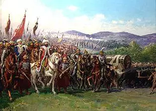 Having previously established a large foundry about 150 miles (240 km) away, Mehmed now had to undertake the painstaking process of transporting his massive artillery pieces. In preparation for the final assault, Mehmed had an artillery train of 70 large pieces dragged from his headquarters at Edirne, in addition to the bombards cast on the spot.[47] This train included Orban's enormous cannon, which was said to have been dragged from Edrine by a crew of 60 oxen and over 400 men.[12]:374[22]:77–78 There was another large bombard, independently built by Turkish engineer Saruca, that was also used in the battle.[44][45]