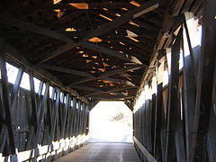 The bridge currently rests on concrete and fieldstone footings at each end put in place in 1905. As is typical for covered bridges, it is a frame structure with a gabled roof that is covered with creosote shingles. Its construction is of the through-truss type, and the white pine (sourced from Greenville, Michigan) trusses are completely sheathed on the outside with rough pine boards.[3] The floor is 14 feet (4.3 m) wide and 100 feet (30 m) long and the bridge has an inside clearance of 12 feet (3.7 m).