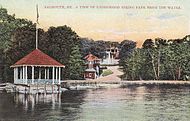 The extension of trolley service from Portland to the Falmouth Foreside in 1898 catapulted the town into the modern era. Trolleys cemented Falmouth’s economic connection to Portland and transformed the Foreside neighborhood into a relaxation spot for nearby city dwellers. Portland’s Yankee elites relocated the Portland Yacht Club and Portland Country Club to Falmouth in 1885 and 1913 respectively, where they have remained ever since. To promote its line, the Portland and Yarmouth Electric Railway Company opened Underwood Spring Park north of Town Landing in 1899. The park’s attractions included a casino, hotel, and outdoor theater. Fire destroyed Underwood Spring Park in 1907 and was not rebuilt. The Portland–Lewiston Interurban also ran up today’s Route 100 in West Falmouth. People’s growing preference for the automobile spelled the end for trolleys, which ended service in 1933.[10]