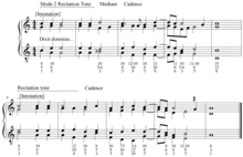 Guilielmus is quite specific that the phrase should be set in such a way that the second last chord should be of the form with a fifth between bass and tenor[4] (and therefore with the soprano a tenth above the bass). Since most tenors (cantus firmi, traditional chant melodies) would have ended with a descending step to the finalis (the tonal center of a mode, comparable to a tonic), the bass voice would consequently approach the finalis from a fourth below, resulting in a chord succession that anticipates the dominant–tonic relationship that would govern later music. Relative to tonal music, this ending could be described as a Perfect Authentic Cadence, with the soprano ascending from the leading tone to the tonic. However, the other typical form of the Perfect Authentic Cadence, with the soprano descending to the tonic from the supertonic, cannot be created from a strict alternation of 1-5-8-10 and 1-3-5-8 because the supertonic forms the fifth of the dominant chord in that paradigm, and neither of these voicings contains the fifth in the soprano. Such a cadence would be theoretically possible in composed falsobordoni, since a strict alternation is not necessary in such compositions, but this cadence paradigm is not typical in historical falsobordoni because of the strong tendency for the descending step to be placed in the tenor in Renaissance polyphony.
