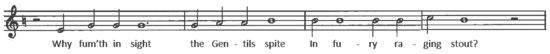 Tallis's theme was one of nine tunes he wrote for the Psalter of 1567 of the Archbishop of Canterbury, Matthew Parker. It was a setting of Parker's metrical version of Psalm 2, which in the King James Bible version begins, "Why do the heathen rage, and the people imagine a vain thing?", and is rendered by Parker as "Why fumeth in sight: The Gentils spite, In fury raging stout? Why taketh in hond: the people fond, Vayne things to bring about?".[n 2] The tune is in Double Common Metre (D.C.M. or C.M.D.).[12]