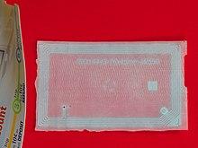 The plastic inlay (right) that contains IC and antenna inside the Standard Ticket paper contactless smart card (left)[17]