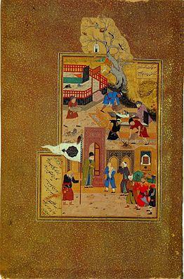 Collection at the Metropolitan Museum of Art, New York. Folio from an illustrated manuscript dated c.1600. Paintings by Habiballah of Sava (active ca. 1590–1610), in ink, opaque watercolor, gold, and silver on paper, dimensions 25,4 x 11,4 cm.[22]