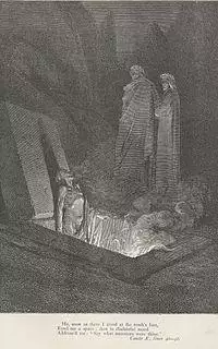 Therefore, Farinata appears with several other atheists and heretics in Canto X of Dante's Inferno. Since they denied the immortality of the soul, their eternal punishment is to be entombed in fiery coffins, the dead among the dead, within the city of Dis.