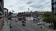 A notorious building on Farringdon Road was the Farringdon Road Buildings, a five-tenement block of dwellings built for the working classes during the Victorian era. Lacking bathrooms and with poor sanitary conditions this building, one of the last slum dwellings to exist in central London, was still occupied until the early 1970s. Common features were poor lighting, overcrowding, with rat- and cockroach-infested living conditions, and people trapped by their own poverty. The residents were re-housed by Islington Borough Council and the buildings, close to Exmouth Market and the Royal Mail Mount Pleasant Sorting Office, were pulled down in the mid-1970s to be replaced by a multi-storey car park. A contemporary description of the buildings is given in George Gissing's novel The Nether World.[1]