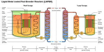 - Loop type, in which the primary coolant is circulated through primary heat exchangers outside the reactor tank (but inside the biological shield due to radioactive sodium-24 in the primary coolant)