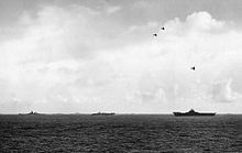 The ships of each task group sailed in a circle formation centered on the carriers. The supporting ships sailed relatively close by, and added their anti-aircraft fire to that of the carriers to help ward off attacking aircraft. When under attack by torpedo aircraft, the task group would turn toward the oncoming aircraft to limit attack angles.[4] Other than this measure, the carriers in the task group would not take evasive action from their attackers. This was in marked contrast with the Imperial Japanese Navy, but the choice made for more stable platforms for the anti-aircraft fire of all the ships in the task group and allowed the ships in the group to sail more closely together. The primary defense of the group against air attack was the group's own fighter cover.