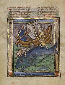 A similar monster appears in the Legend of Saint Brendan, where it was called Jasconius.[11] Because of its size, Brendan and his fellow voyagers mistake it for an island and land to make camp. They celebrate Easter on the sleeping giant's back, but awaken it when they light their campfire. They race to their ship, and Brendan explains that the moving island is really Jasconius, who labors unsuccessfully to put his tail in its mouth.[12]