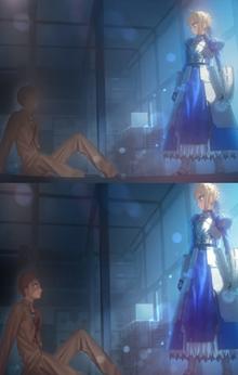 The first of the three heroines, Saber is an agile and powerful warrior who keeps her identity secret, hence her substitute name after her role as a member of the Saber class. She also serves as the route's servant protagonist. She was the victor of the Fourth Holy Grail War with another Master and claims to be the strongest out of all Servants in the Saber Class. However, Shirou is against Saber's constant aim for conflicts with other servants and instead seeks to ally with Rin. Shirou decides to drop his pacifism when he discovers that his former friend, Shinji Matou, is a Master, with the Servant Rider, aiming to kill all the students from their school to increase Rider's powers. Following Shinji and Rider's defeat, Shirou learns that Saber cannot fight at her full strength without an exchange of Mana energy of her master. During a confrontation with the Master Illya and her Servant Berserker, Shirou passes Saber his Mana and later assists her to defeat the enemy by projecting one of Arturia's swords in combat. As Shirou seeks to aid to keep Saber in their world, he learns from the priest Kirei Kotomine that the Holy Grail is cursed. It is revealed that Shirou's late guardian, Kiritsugu, once used Saber to destroy the Grail, but it instead caused the fire where Shirou lost his family. Shirou rejects the idea of accepting his wish of the Holy Grail as he decides to accept his past and not forget Saber. Moved by Shirou, Saber also rejects the Holy Grail, believing she should not change Britain's history. As Kotomine aims to use Illya's body to recreate the Holy Grail, Shirou and Saber confront him and his servant Gilgamesh.[6] Following Shirou's and Saber's victories, Shirou orders Saber to destroy the Grail. This causes Saber to go back to her last moments before her death.[7] In the Réalta Nua version of the game, a new ending can be unlocked where Shirou becomes a heroic spirit in order to meet Saber in the afterlife of heroes, Avalon.[8]