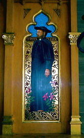 His superiors thought that he was not a good candidate for the priesthood because he lacked education. However, he was not considered unintelligent. Because he learned Latin well from his brother, his superiors decided to allow him to become a priest. During his ecclesiastical studies, Damien prayed daily before a picture of St. Francis Xavier, patron of missionaries, to be sent on a mission.[12][13] Three years later when his brother Father Pamphile (Auguste) could not travel to Hawaiʻi as a missionary because of illness, Damien was allowed to take his place.[14]