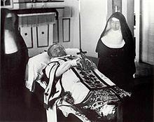 With an arm in a sling, a foot in bandages, and his leg dragging, Damien knew death was near. He was bedridden on 23 March 1889, and on 30 March he made a general confession.[28] Damien died of leprosy at 8:00 a.m. on 15 April 1889, aged 49.[29] The next day, after Mass said by Father Moellers at St. Philomena's, the whole settlement followed the funeral cortège to the cemetery. Damien was laid to rest under the same pandanus tree where he first slept upon his arrival on Molokaʻi.[30]