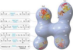 The above observations seemed incompatible with the classical 'head-to-tail' model for FAS organization, and an alternative model has been proposed, predicting that the KS and MAT domains of both monomers lie closer to the center of the FAS dimer, where they can access the ACP of either subunit (see figure on the top right).[24]