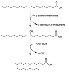 Tuberculostearic acid (D-10-Methylstearic acid) is a saturated fatty acid that is known to be produced by Mycobacterium spp. and two species of Streptomyces. It is formed from the precursor oleic acid (a monounsaturated fatty acid).[28] After oleic acid is esterified to a phospholipid, S-adenosyl-methionine donates a methyl group to the double bond of oleic acid.[29] This methylation reaction forms the intermediate 10-methylene-octadecanoyal. Successive reduction of the residue, with NADPH as a cofactor, results in 10-methylstearic acid[24]