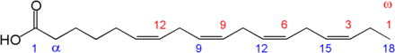 - ^ The position of the carbon atoms in a fatty acid can be indicated from the COOH- (or carboxy) end, or from the -CH3 (or methyl) end. If indicated from the -COOH end, then the C-1, C-2, C-3, ... .(etc.) notation is used (blue numerals in the diagram on the right, where C-1 is the –COOH carbon). If the position is counted from the other, -CH3, end then the position is indicated by the ω-n notation (numerals in red, where ω-1 refers to the methyl carbon).