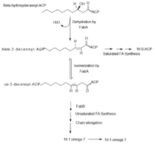 - The two main unsaturated fatty acids made are Palmitoleoyl-ACP (16:1ω7) and cis-vaccenoyl-ACP (18:1ω7).[14]