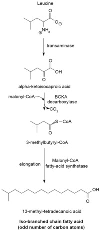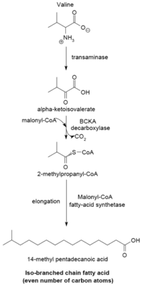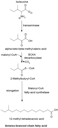 The branched-chain fatty acid synthesizing system uses α-keto acids as primers. This system is distinct from the branched-chain fatty acid synthetase that utilizes short-chain acyl-CoA esters as primers.[23] α-Keto acid primers are derived from the transamination and decarboxylation of valine, leucine, and isoleucine to form 2-methylpropanyl-CoA, 3-methylbutyryl-CoA, and 2-Methylbutyryl-CoA, respectively.[24] 2-Methylpropanyl-CoA primers derived from valine are elongated to produce even-numbered iso-series fatty acids such as 14-methyl-pentadecanoic (isopalmitic) acid, and 3-methylbutyryl-CoA primers from leucine may be used to form odd-numbered iso-series fatty acids such as 13-methyl-tetradecanoic acid. 2-Methylbutyryl-CoA primers from isoleucine are elongated to form anteiso-series fatty acids containing an odd number of carbon atoms such as 12-Methyl tetradecanoic acid.[25] Decarboxylation of the primer precursors occurs through the branched-chain α-keto acid decarboxylase (BCKA) enzyme. Elongation of the fatty acid follows the same biosynthetic pathway in Escherichia coli used to produce straight-chain fatty acids where malonyl-CoA is used as a chain extender.[26] The major end products are 12–17 carbon branched-chain fatty acids and their composition tends to be uniform and characteristic for many bacterial species.[25]