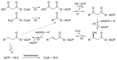 Much like β-oxidation, straight-chain fatty acid synthesis occurs via the six recurring reactions shown below, until the 16-carbon palmitic acid is produced.[1][2]