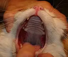 Inflammation of the fauces, known as faucitis, is seen in animals. In cats, faucitis is usually a secondary disease to gingivitis but can be a primary disease. In this species faucitis is usually caused by bacterial and viral infections although food allergies need to be excluded in any diagnosis. Treatment is symptomatic and includes broad-spectrum antibiotics and in severe cases where cats are inappetant, corticosteroids (often given as depot forms, e.g. depomedrol) or chemotherapy (e.g. chlorambucil).