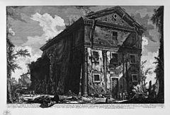 The Temple of Faustina is thought to have been dedicated in 144 CE.[40] It is a grand[41] hexastyle structure[42] with Corinthian columns,[43] possibly designed originally to be a temple of Ceres.[44] Depictions on coins appear to show a cult image of Faustina seated on a throne and holding a tall staff in her left hand.[45] Faustina's portrait on coins from this period is often crowned as well as veiled, which may also recall a feature of Faustina's cult image from the temple.[46]