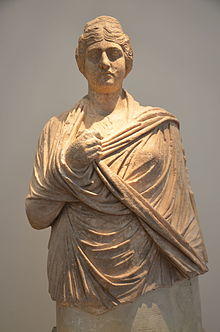 The posthumous cult of Faustina was exceptionally widespread, and Faustina's image continued to be omnipresent throughout Antoninus Pius' principate.[32] A colossal marble head, believed to be that of Faustina and discovered in 2008,[33] figured as one of several monumental imperial statues at the ancient site of Sagalassos in today's Turkey. In Olympia, Herodes Atticus dedicated a nymphaeum that displayed statues of Faustina and other Antonines as well as his own ancestors.[34] Faustina also appears on the Parthian Monument at Ephesus commemorating members of the imperial family.[35] Bergmann and Watson have characterized the commemoration of Faustina as central to Antoninus Pius' political persona.[7][34] One larger-than-life statue, discovered in situ near the Termini railway station at Rome, appears to depict Faustina as Concordia, with a patera and cornucopia; it would have been displayed alongside statues of Diana Lucifera and Apollo-Sol in baths privately owned but available to the public.[36]