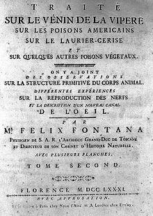Herbermann, Charles, ed. (1913). "Felice Fontana". Catholic Encyclopedia. New York: Robert Appleton Company.- Zoologica Göttingen State and University Library Traité Sur Le Vénin De La Vipere Sur Les Poisons Americains Sur Le Laurier-Cerise Et Sur Quelques Autres Poisons Végetaux 1781